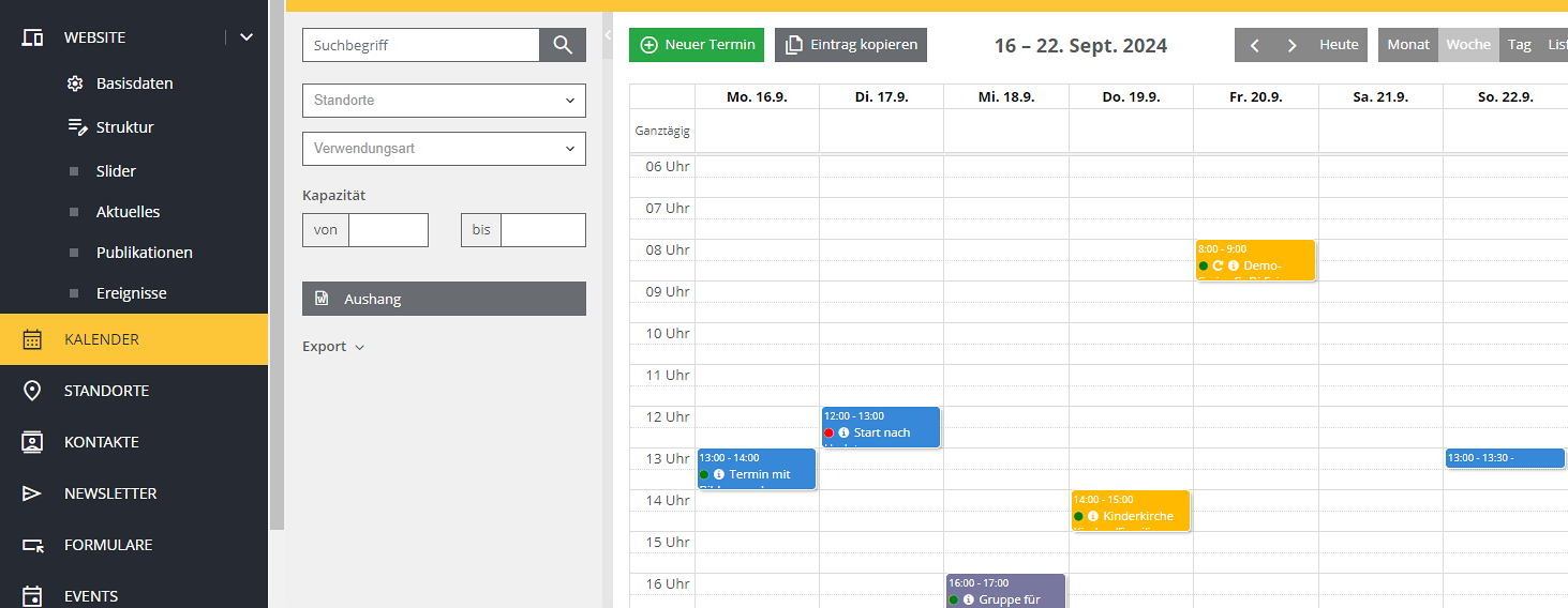 In der ADMIN NAVIGATION können Sie unter dem Punkt "Kalender" sowohl Veranstaltungen wie, Konzerte, Lesungen, Feste, Wallfahrten, ... als auch liturgische Termine (Gottesdienste) neu anlegen, bearbeiten, löschen, suchen, filtern, kopieren und für einen Aushang exportieren.