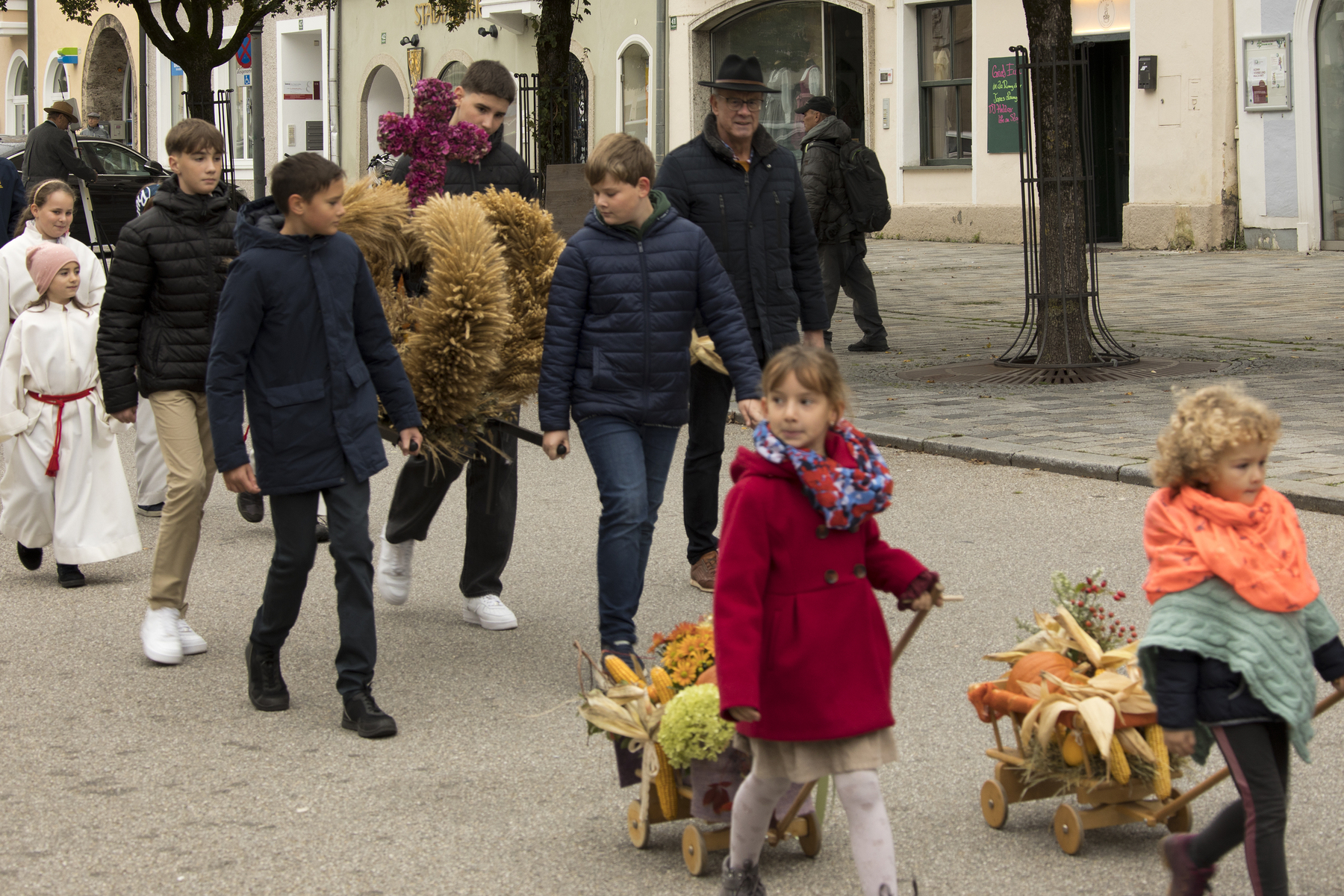 Mit der Segnung von Erntekrone, Erntebüscherl und Gaben, die vor allem die Kinder mitgebracht hatten, begann die Feier zum Erntedank mit musikalischer Begleitung durch die Stadtkapelle am Stadtplatz. Nach dem Festzug zur Stadtpfarrkirche feierte Monsignore Stefan Hofer mit vielen Gläubigen die Heilige Messe. Auch VertreterInnen von verschiedenen Vereinen und Gruppierungen wie der Goldhaubengruppe Braunau-Stadt, dem Seniorenbund und Bürgermeister Hannes Waidbacher feierten mit der Pfarrgemeinde.