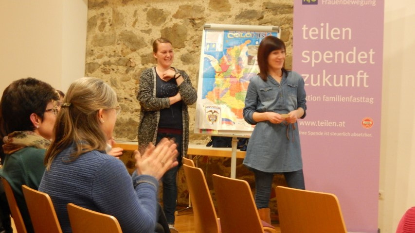 Mit Hilfe der Dolmetscherin Christina Lanmüller Romero und Anneliese Schütz von der kfb Linz vermittelte Ana-Maria Berrio Ramirez den Zuhörerinnen und Zuhörern ein anschauliches Bild von der Arbeit der kolumbianischen Frauenorganisation "Corporación Vamos Mujer".